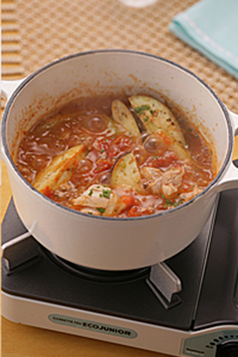 - 锅中放入番茄,淋一圈酒。开中火,盖上锅盖煮7-8分钟。水分蒸发后撇除浮沫,煮沸后加入豆瓣酱,再将调料A依次加入,再煮2-3分钟。加入鸡腿肉,西芹和茄子,盖上盖子再煮4-5分钟即可。